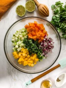 - Combine the diced papaya, mango, green apple, red onion, jalapeño and finely chopped cilantro in a large bowl