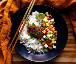 There are so many ways to use this papaya, mango and green apple salsa! My first recommendation would definitely be with this sweet chili lime salmon, but I also love it over fish tacos, steak tacos, chickpea tacos… ok any tacos and its also great with barbecue. There is something wonderful about combining these tropical flavors with a tangy barbecue chicken or ribs. Refreshing and satisfying. What more could you ask for from a beautiful bowl of salsa?