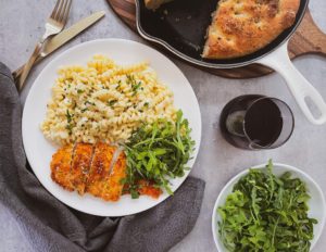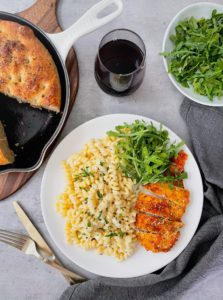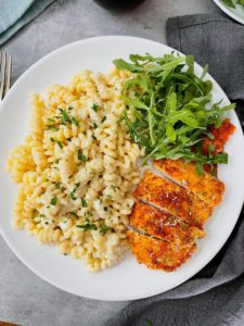 Take a look at that plate! So comforting and indulgent. The pasta is flavorful and super creamy, the chicken is crispy and well seasoned and the arugula adds a fresh, peppery green element that nicely balances out the plate.
