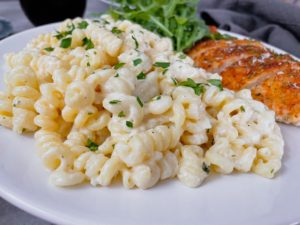 There are few dishes that are as comforting as a creamy bowl of pasta. Whether you are enjoying a big bowl of macaroni and cheese or plate piled with ribbons of fettuccini alfredo, a bowl full of warm, creamy noodles just cures what ails you. Then when you add a golden brown piece of crispy, flavorful chicken next to it… comfort has commenced.