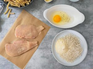 In addition to the sauce ingredients, you will need 10 ounces of pasta (I highly recommend some curly cavatappi), 2 chicken breasts, a pinch of garlic powder and onion powder, 1 egg, 1/2 cup of panko and 1/2 cup of grated parmesan.