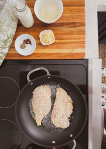 Once the chicken is golden brown and crispy on both sides and cooked through with an internal temperature of 165 degrees, transfer it onto a paper towel lined plate and set aside for now.
