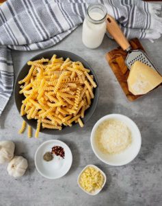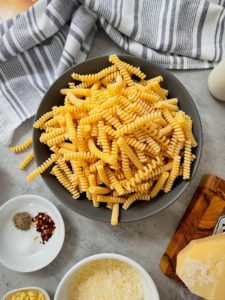 As for the pasta, I love using a super curly pasta like this beautiful cavatappi. All of the swirls and crevasses hold onto the sauce really well, but really, any pasta will work nicely.