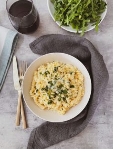 This bowl is every bit as comforting as it looks. It is creamy and garlicky with lots of melted parmesan and just a hint of heat in the background from a little pinch of crushed red pepper flakes and black pepper.