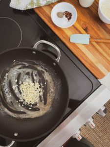 - As soon as the butter has melted, add the finely minced garlic and cook, stirring constantly, for about 60 seconds