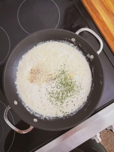Start by bringing a large pot of water to a rolling boil. While you are making the parmesan garlic cream sauce, cook the pasta according to the manufacturers instructions. Don’t forget to add a big pinch of salt to the water!