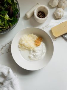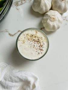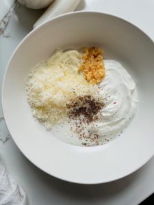 Like most dressings, this one is very simple to bring together. You’ll need 2/3 cup of full fat plain greek yogurt or sour cream. The greek yogurt will be thicker and more tangy and the sour cream is smoother and more mild. I like it both ways, so use whatever sounds best to you or what you have on hand.