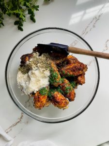Add 1/4 cup of grated parmesan and a big pinch of the ranch seasoning mixture and toss the wings until they are all coated in the herb butter, seasoning and parmesan.
