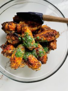 Bake the wings in a 425 degree oven for 45-60 minutes turning them every 20 minutes. Once the wings are cooked through (with an internal temperature of 165 degrees) and the skin is nice and crispy, transfer the baking sheet onto a heat proof surface and let the wings relax while you prepare the herb butter…