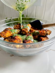Transfer the crispy baked wings into a large bowl and drizzle the herb butter over them.