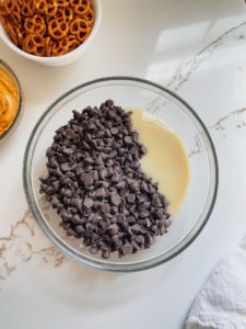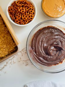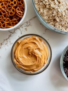 For the top layer, you will need 1 1/2 cups of creamy peanut butter and about 1/2 cup of pretzels. I am using these adorable little mini pretzels, but any pretzel will work for these bars, because we are breaking them into pieces before adding them.