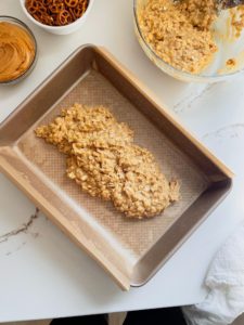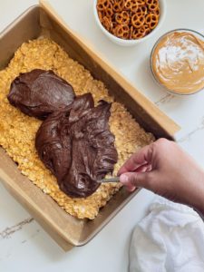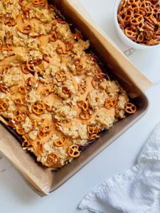 Last, but definitely not least, crumble the remaining 1/3 of the oat mixture over the melted peanut butter and sprinkle the pretzel pieces over everything.