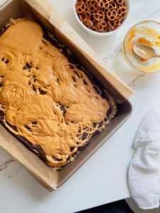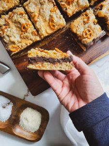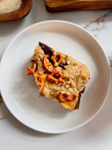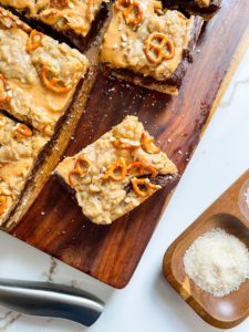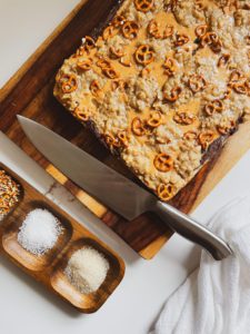 - Crumble the remaining oat mixture over the peanut butter layer and top with pretzel pieces and a light sprinkling of flaky sea salt
