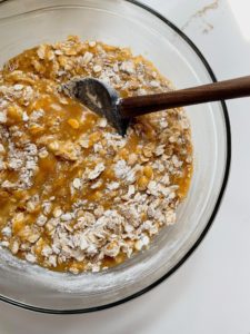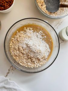 - Add 2 1/2 cups of all purpose flour, 3 cups of oats and 1 teaspoon of salt and use a silicone spatula to mix until just combined