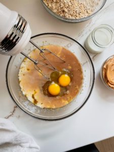 In a large bowl, combine 1 cup of room temperature butter with 2 cups of brown sugar until creamy. You can do this by hand with a stiff whisk or using an electric hand mixer.