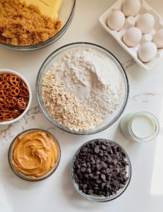 For the base, you will need 1 cup of room temperature butter, 2 cups of brown sugar, 2 large eggs, 1/3 cup of milk , 2 teaspoons of vanilla extract, 2 1/2 cups of all purpose flour, 1 teaspoon of salt and 3 cups of old fashioned oats.