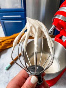 This is the consistency that I typically aim for. When I pull my whisk out of the bowl, the whipped cream will hold its shape and not droop over. If it droops, I whip it for another 10-20 seconds and check again.