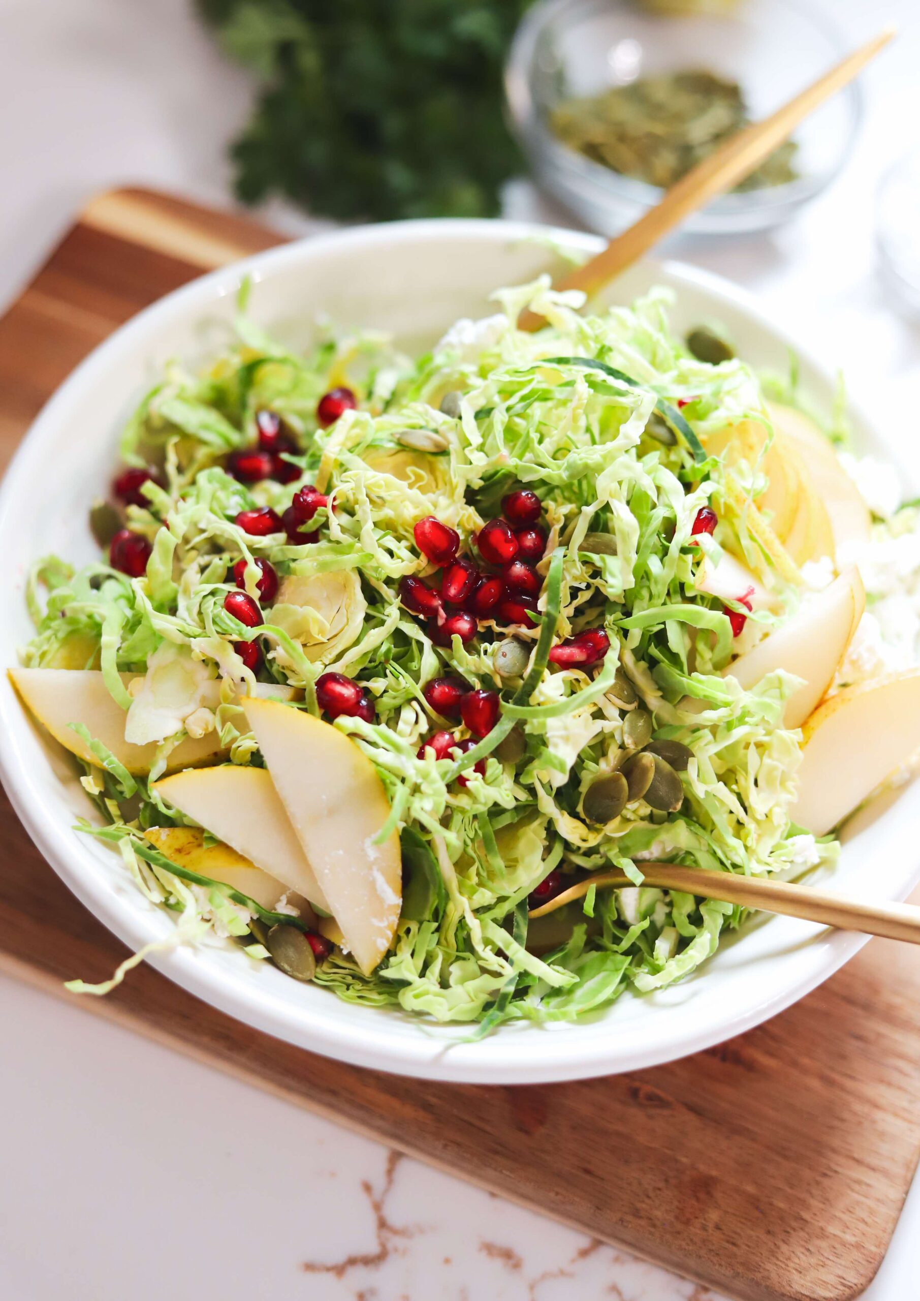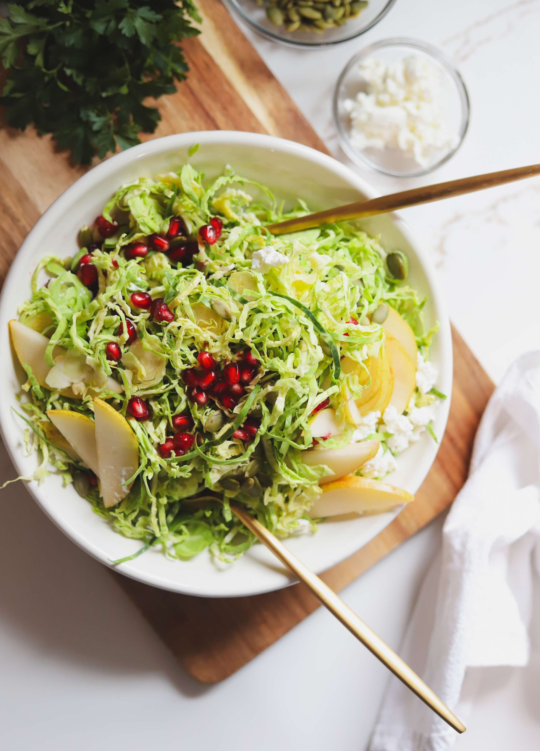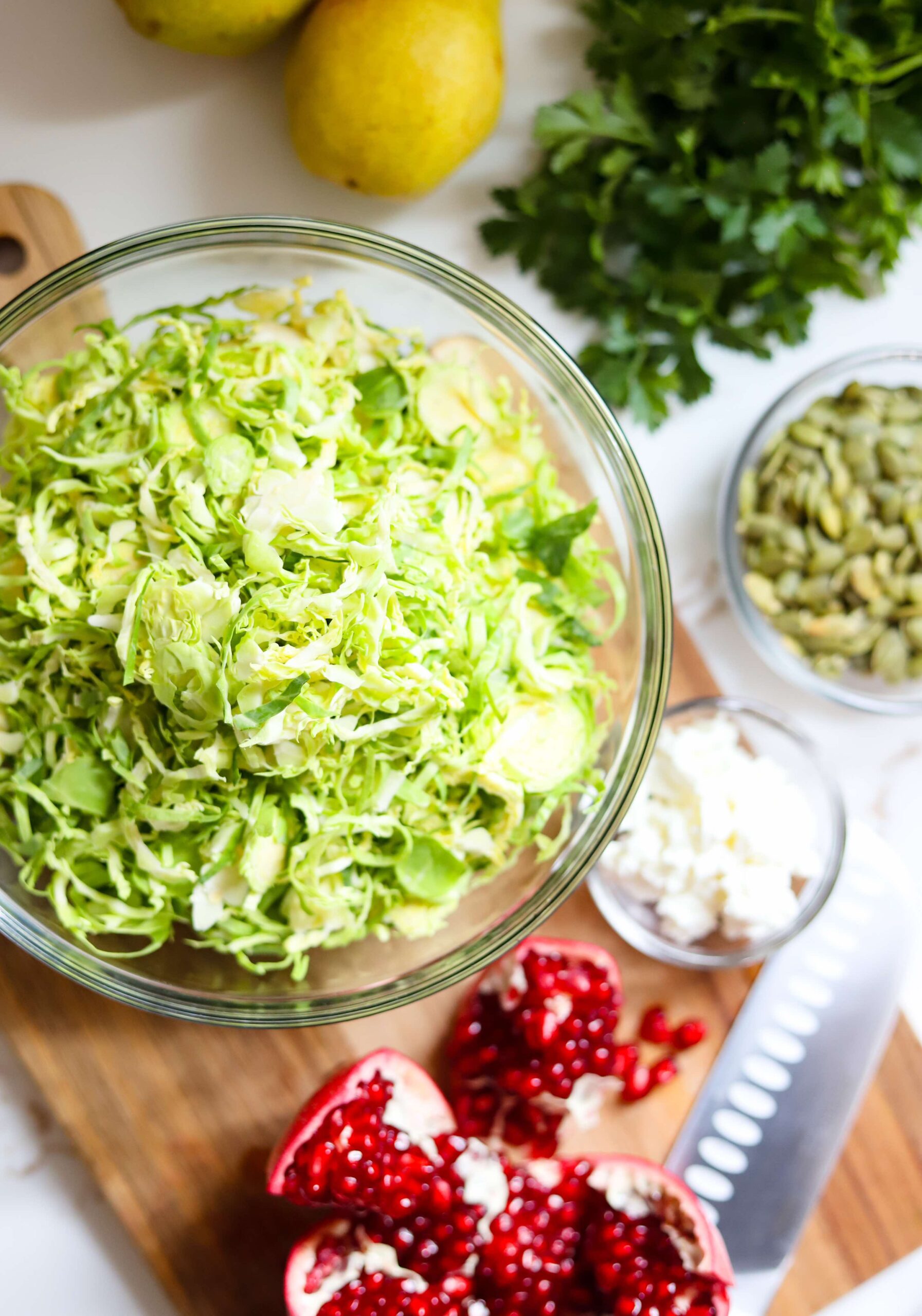 - Add the shaved brussel sprouts along with a large thinly sliced pear, 4 ounces of pomegranate seeds, 1/3 cup of pepitas and 1/4 cup of crumbled goat cheese