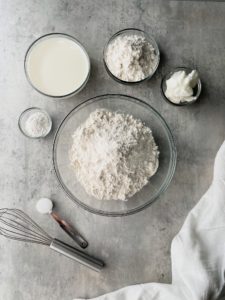 - In a large bowl, whisk 375 grams of all purpose flour with 1 teaspoon of salt and 2 teaspoons of baking powder
