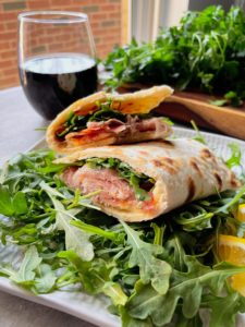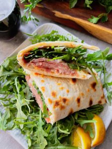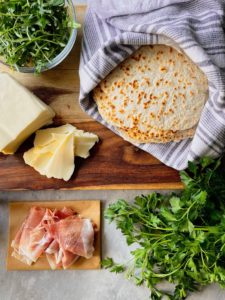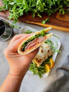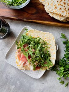 Add a layer of thinly sliced prosciutto and a big handful of arugula and fold the piadina in half. Gently press down and slice the folded piadina in half. If you are not a fan of plain arugula, I suggest either tossing it in some olive oil and a squeeze of lemon or adding leafy greens or wilted kale instead. Any green will work, cool or wilted.
