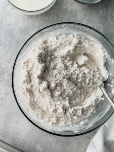 In a large bowl, whisk the flour, salt and baking powder and then add the shortening. There are several ways that you can incorporate the shortening into the flour. The OG method is by pressing small pieces of shortening into the flour with your fingers, but you can also do this with a stiff fork or dough cutter similar to woking butter into biscuit dough.