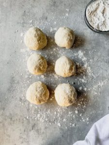 Divide the ball of dough into 6 equal portions and form each portion into a ball. Place the portions of dough onto a lightly floured surface, cover them with a kitchen towel and let them rest for 10 minutes.