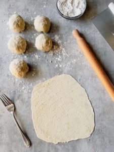 Place a flat skillet or griddle over medium heat and begin shaping your first portion of dough…