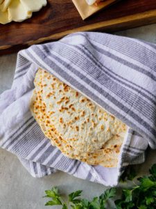 - Transfer the cooked piadina into a large kitchen towel and wrap it to keep it warm while you work with the other portions of dough