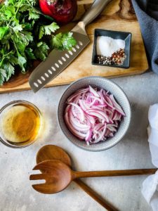 Once everything has been whisked together, pour the mixture over the thinly sliced onions and give them a good toss. Cover the bowl tightly with plastic wrap and place them into the refrigerator to chill until you are ready to use them. They get better with time, but you can technically use them after 15-20 minutes if you are tight on time.