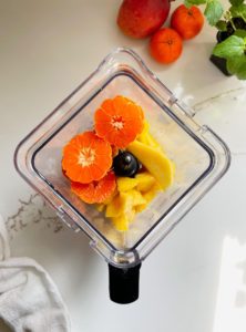 All you’ll need is a cup of pineapple (fresh or frozen), a cup of mango (fresh or frozen), 2 peeled clementines, 1/2 cup of plain Greek yogurt and 1 scoop of vanilla protein powder. Easy, right?