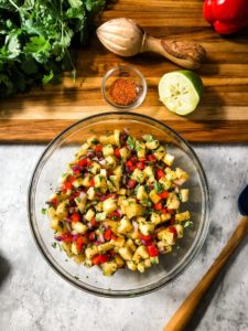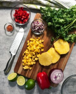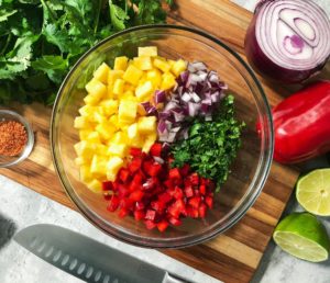 Combine the diced pineapple, red sweet bell pepper, red onion and fresh cilantro in a large bowl. Squeeze the juice of 1 big lime over everything, add a few pinches of tajin and toss to combine…