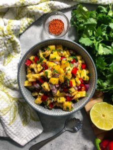 For a salsa containing only 6 simple ingredients, this pineapple salsa is absolutely fabulous! The pineapple is sweet and tart, the red onions and sweet bell peppers are super crunchy and fresh and then the lime juice and tajin add saltiness and a hint of spice.