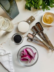 Begin by gathering 1/2 cup of extra virgin olive oil, 1/3 cup white wine vinegar, 1/3 cup of chopped red onion, 1/4 cup of granulated sugar, 2 teaspoons of honey dijon mustard, 1/2 teaspoon of Himalayan pink sea salt (or kosher salt) and 1 tablespoon of poppy seeds (I love Spice Islands Poppyseeds!).