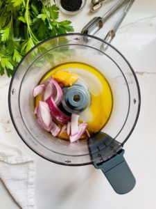 You will need a blender or food processor to fully incorporate the onions into this dressing. You don’t need anything real powerful, just a regular blender will do the trick. And if you have never done so before, I love making dressings in a blender! They come together super fast and the blender helps thicken the mixture and create a creaminess that would require quite a whisking arm… and who wants to work that hard for a salad dressing?