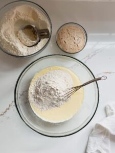 Begin by whisking a tablespoon of active dry yeast and a teaspoon of granulated sugar into 1/3 cup of warmed whole milk. Set it aside for a few minutes to let it bloom. If you are new to working with yeast, yeast has to be woken up before you use it. Yeast loves a nice warm temperature and a little snack (but, who doesn’t?) and in just a few minutes, it will get all foamy and frothy telling you that it has “bloomed” and is ready to go to work.