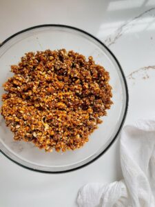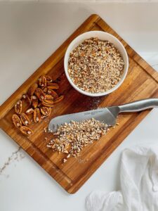 While the sugar mixture is coming to a simmer, very finely chop or grind 3 cups of nuts. The texture of the nuts is up to you. Some recipes call for all of them to ground down completely, while others suggest a rough chop. I prefer them just a notch about ground or what I would call very finely chopped. No big pieces that could potential poke through the dough, just a nice fine texture.