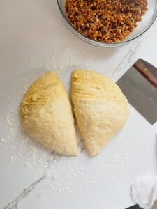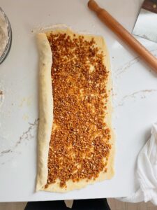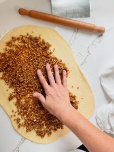 Divide the cooled filling evenly throughout the portions of dough and spread it out to within 1/2″ of one of the long sides. The filling should not be thickly covering the dough, as adding too much filling can cause the loaves to crack or split as they bake.