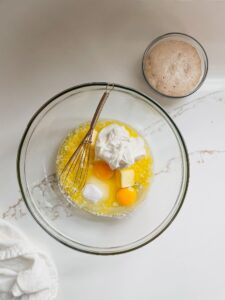 While the yeast is waking up, combine 1/4 cup of granulated sugar, 1/2 teaspoon of salt, 2 large eggs, 2/3 cup of sour cream and 12 tablespoons of softened butter in a large bowl and whisk until creamy.