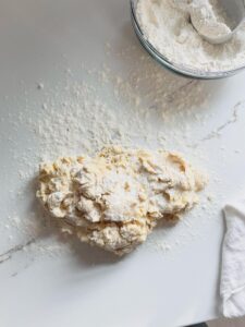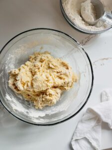 This is what the dough should look like at this stage. We want these loaves to stay light, so we will be adding only the flour that is necessary to bring everything together. This is best done as you knead, so you can feel the dough with your hands to tell whether it still feels like it needs more flour or if it is starting to feel stiff or dry.