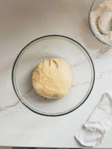 - Once the dough has doubled in volume, transfer it onto a lightly floured surface and divide the dough in half