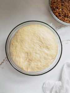 My oven has a “proof” setting, which maintains a temperature of about 85 degrees and this is like a doughs ideal situation. If your oven does not have this setting, you can set the bowl on a table in direct sunlight or even toss a bath towel in the dryer and wrap the bowl in it to help keep things cozy.