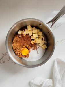 - Combine 1/2 cup of granulated sugar, 1/2 cup of brown sugar, 6 tablespoons of butter, an egg yolk, 1 teaspoon of vanilla extract and 1/2 teaspoon of ground cinnamon into a small saucepan and place over medium heat