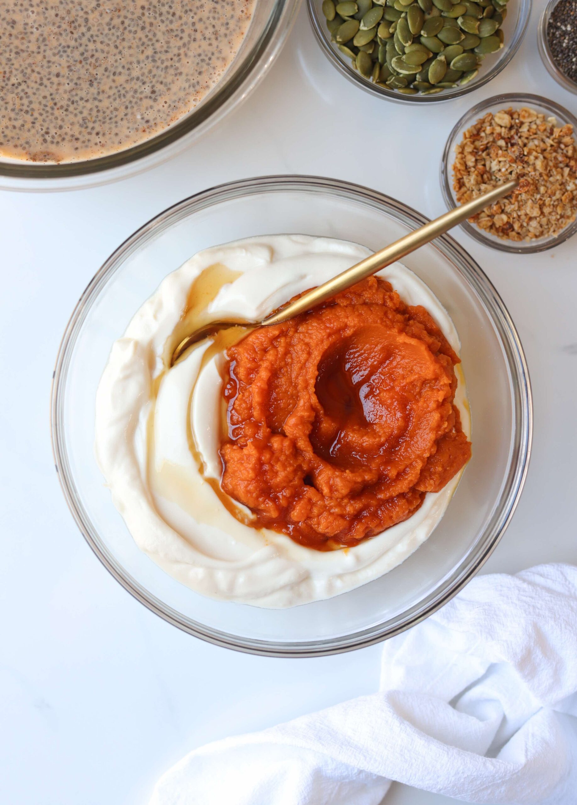 When the chia pudding is ready to go, mix 3/4 cup of pure pumpkin puree into 2 cups of plain or vanilla greek yogurt and add a tablespoon of pure maple syrup if you prefer your breakfast to be just a little bit sweet.