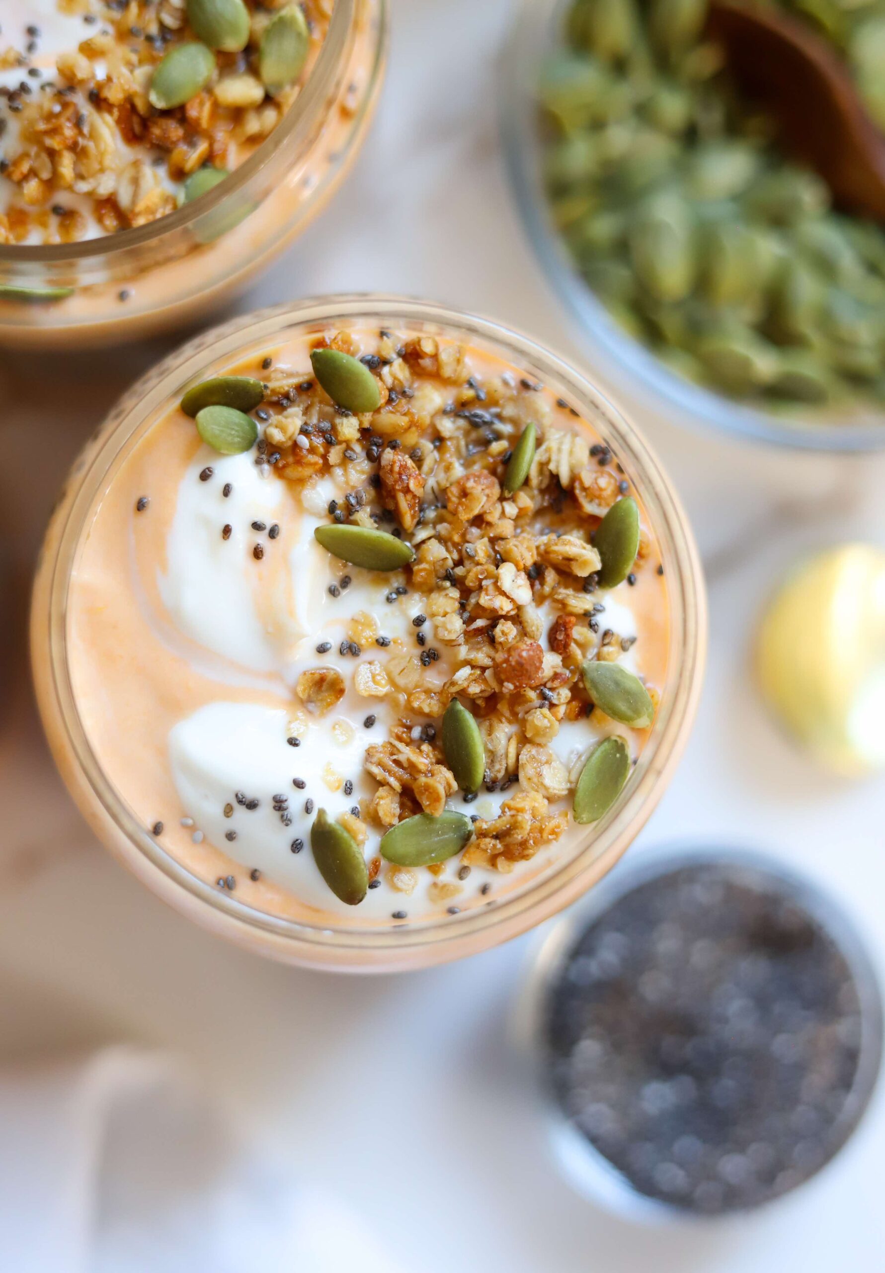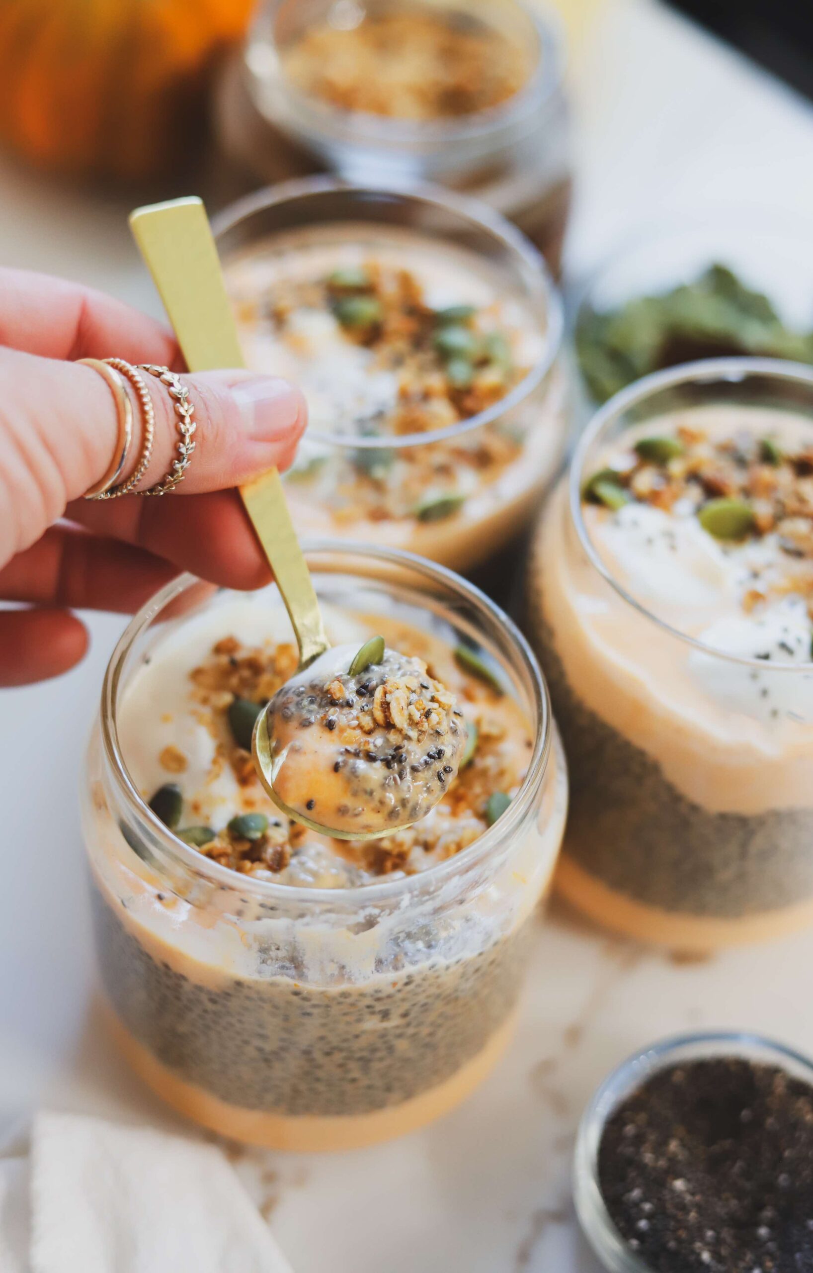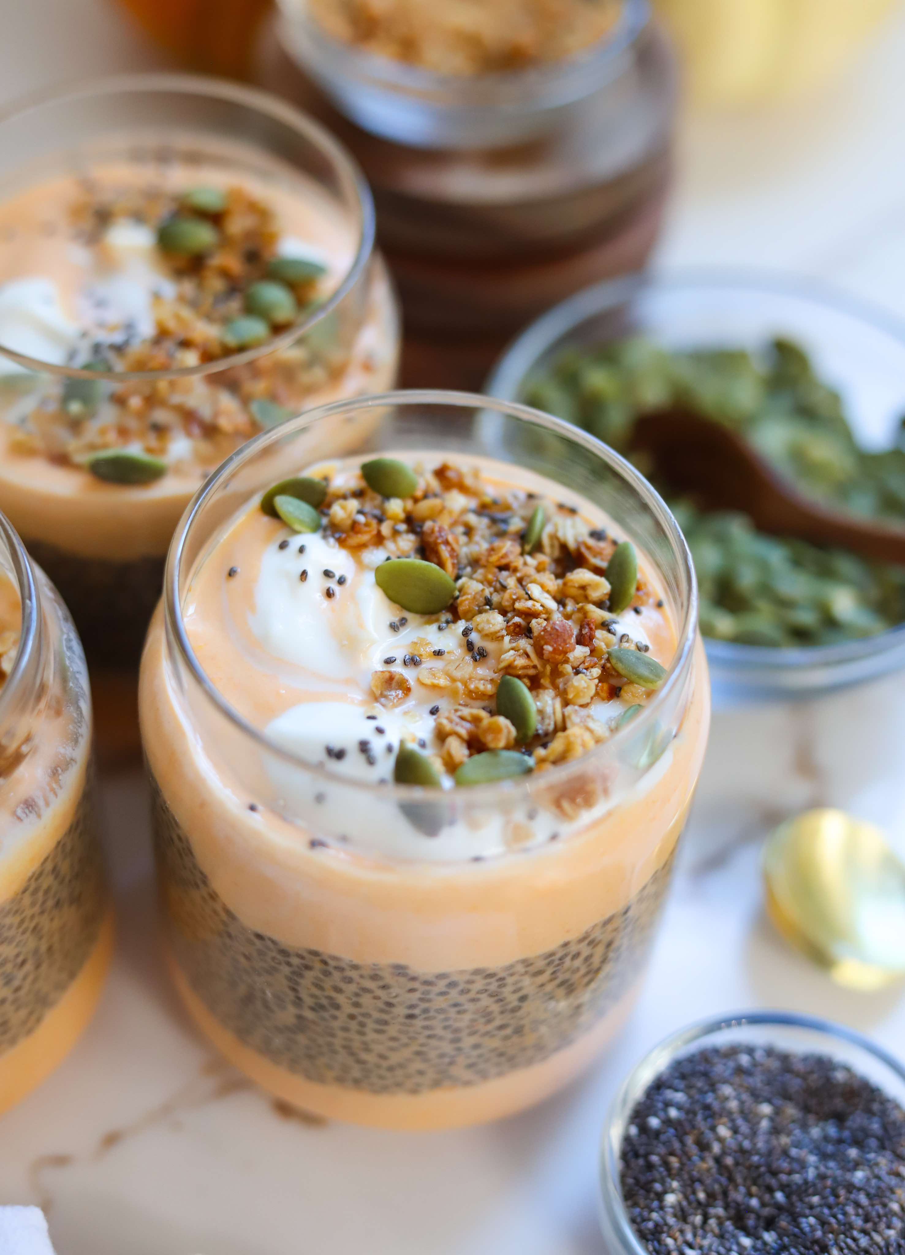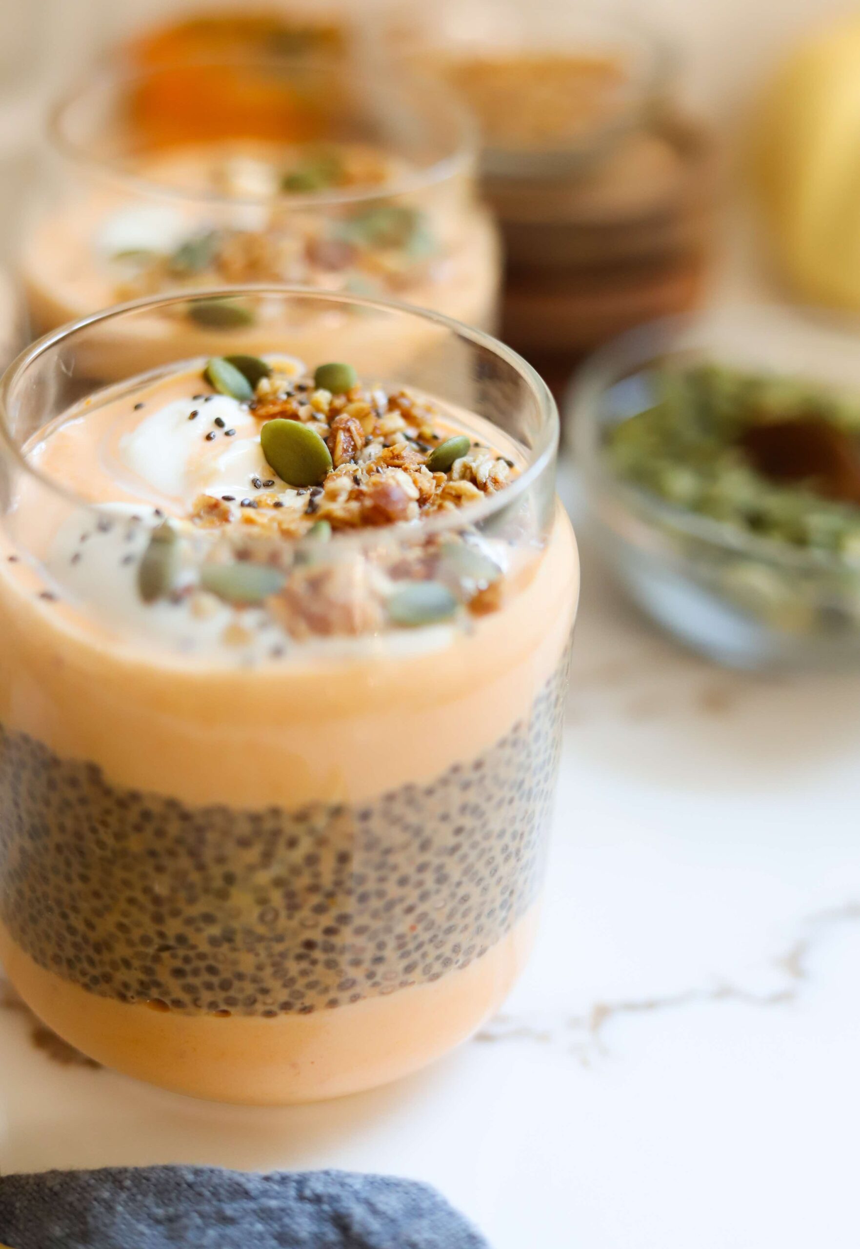 - Assemble the parfaits by layering the pumpkin chia pudding with the pumpkin yogurt and topping with granola and pepitas