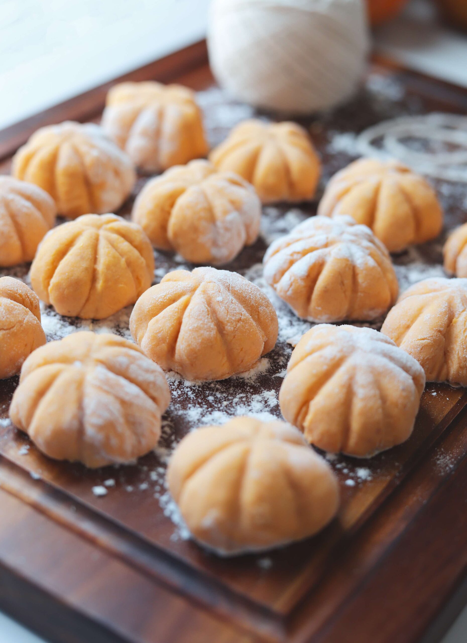 Use kitchen twine to create the little pumpkin curves. Gently press the twine over the little balls of dough in four different positions. I like to start with an X (one line working north to south and another line working east to west) and then follow with two additional diagonal lines equally dividing the ball into a tiny little pumpkin.