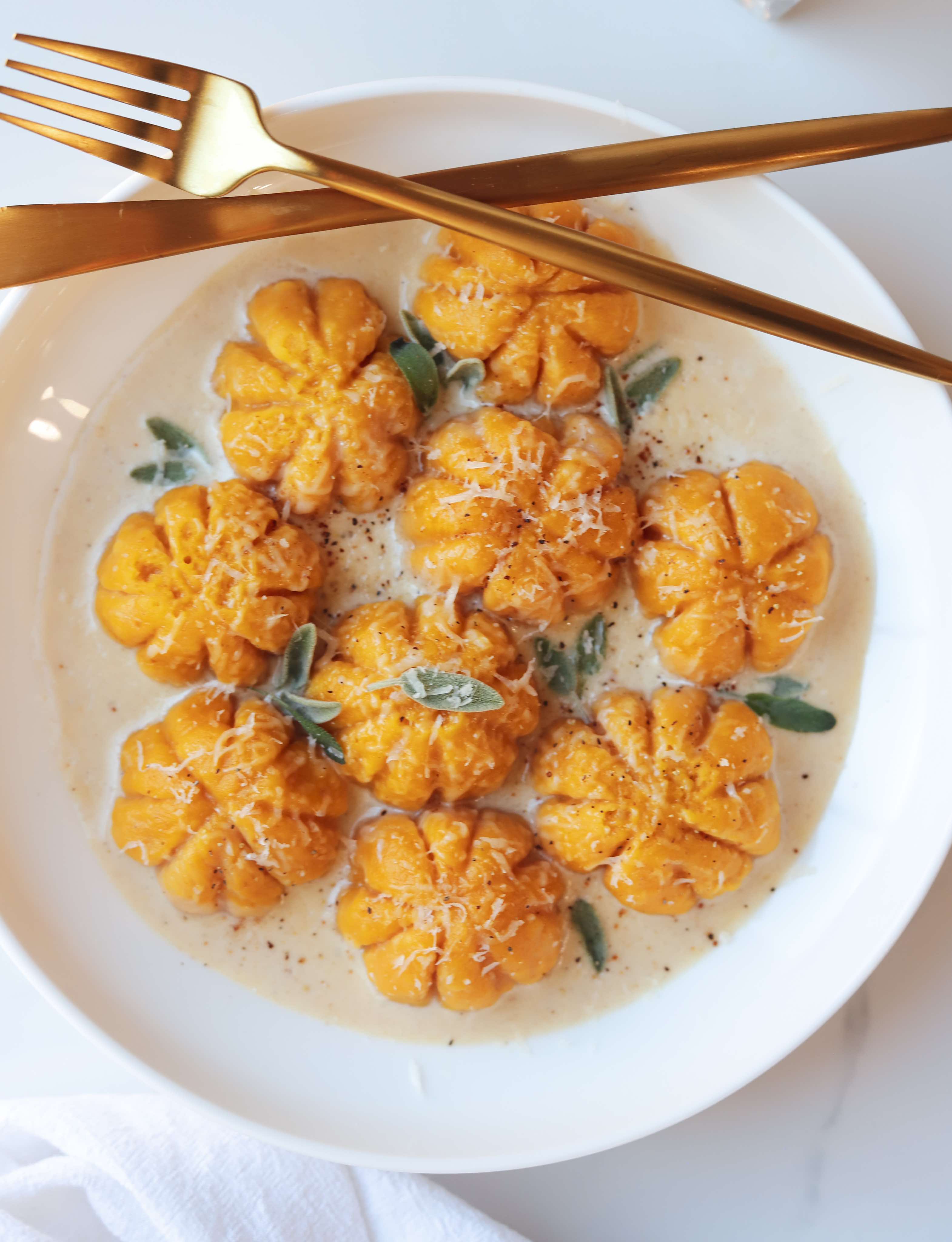 Cook your pumpkin shaped gnocchi as you would any other gnocchi and as soon as those adorable pillows of delicious goodness start to float, transfer them into the sauce of your choice.