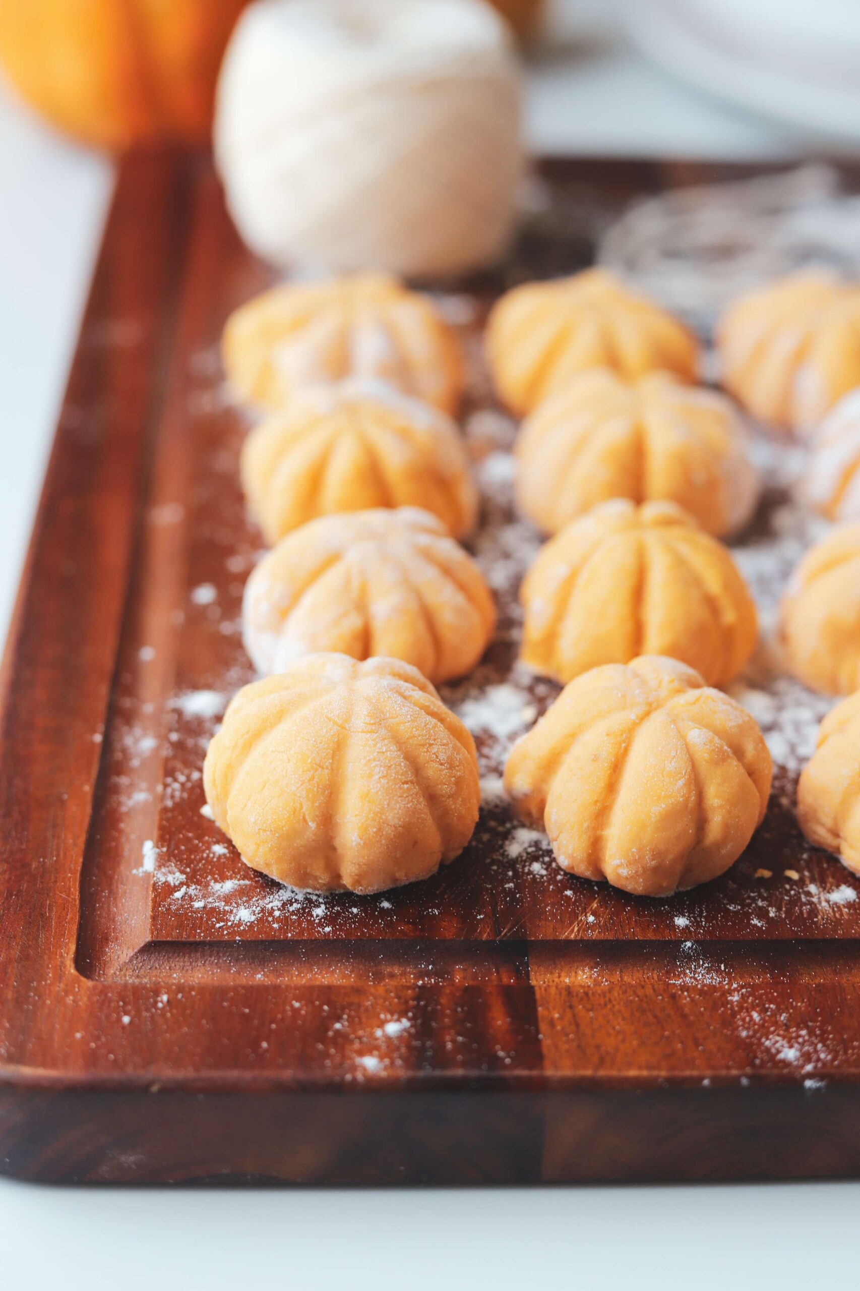 Transfer the gnocchi onto a floured board and continue shaping until all of your dough is formed into adorable little pumpkins.