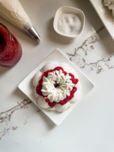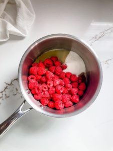 Start by adding 10 ounces of fresh raspberries, 1/4 cup of granulated sugar, 2 tablespoons of orange juice and a teaspoon of vanilla extract into a saucepan and place over medium heat. Bring the mixture to a simmer and let it simmer until the raspberries begin to break down. This should take just a few minutes, so stay close by and remove the sauce pan from the heat as soon as it begins to happen.