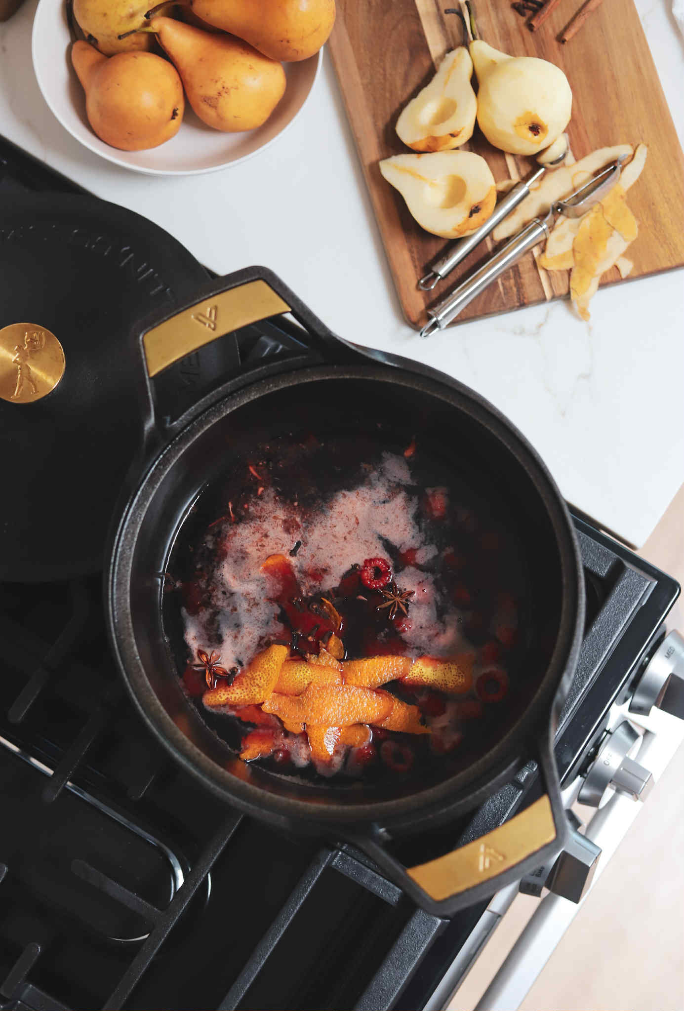 - In a non-reactive pot or well seasoned cast iron, combine 600 ml of merlot with the peel from a small oranges, 2 small cinnamon sticks, 1-2 star anise, 8 whole cloves, 1/3 cup of brown sugar, 1/2 cup of orange juice, 2 teaspoons of pure vanilla extract and an optional 6 ounces of fresh berries