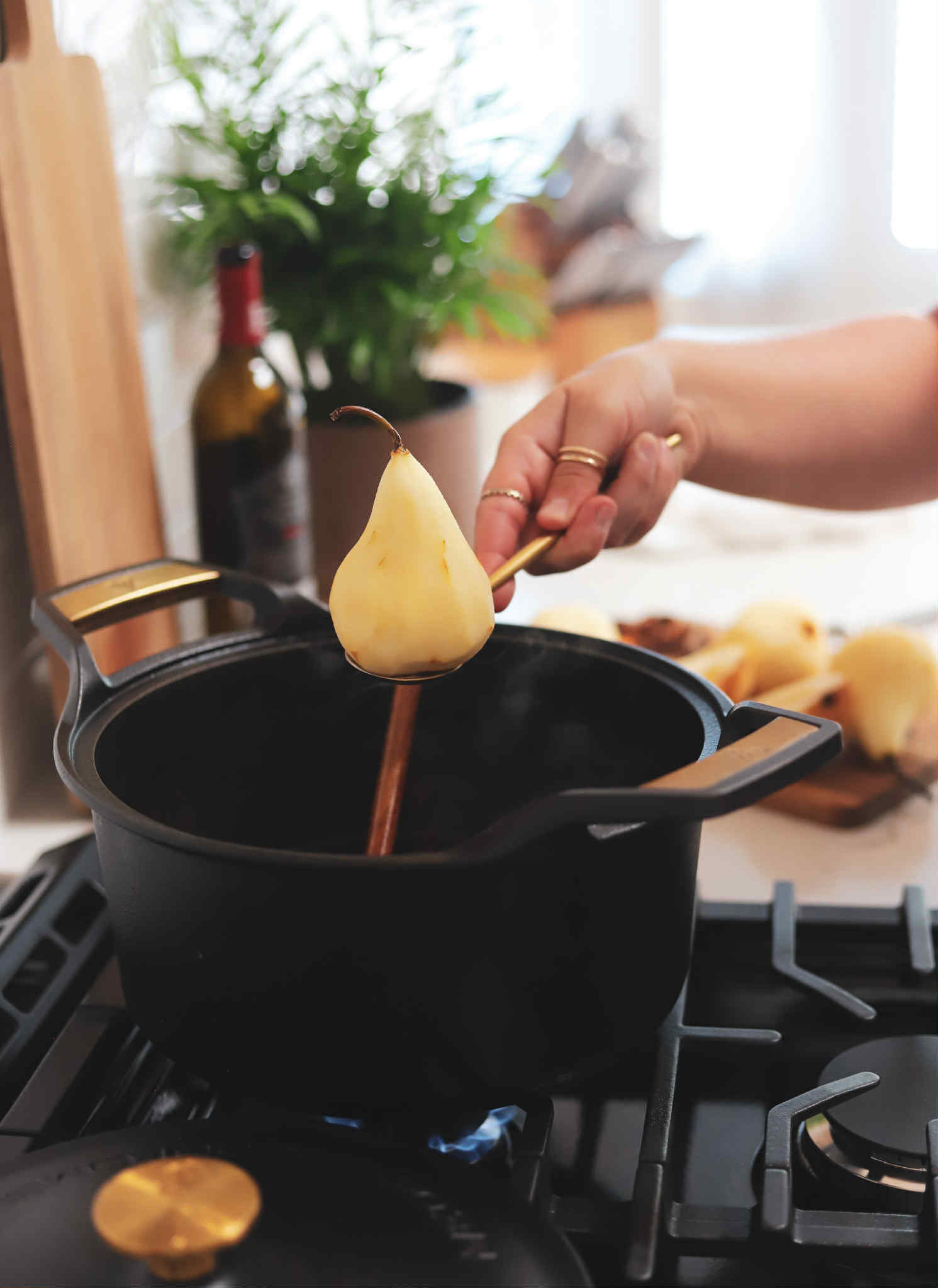 Stir the poaching liquid while it boils until you can feel that all of the brown sugar has dissolved and then gently place the peeled pears into the poaching liquid. Place them at an angle so about half of each pear is submerged.